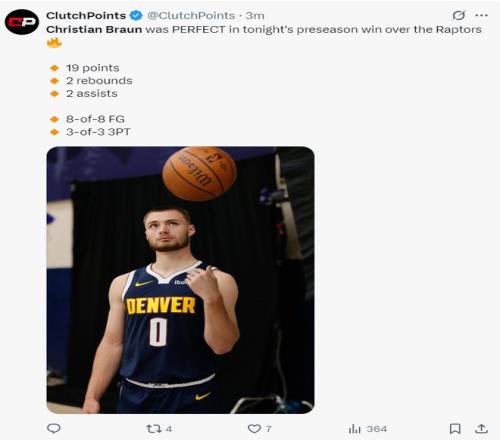 季前赛约基奇5中5布劳恩8中8莺歌首秀掘金31失误仍擒猛龙