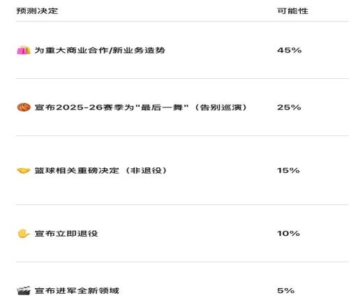 “最后一舞”的智慧:直接退役的可能性被高估。对于勒布朗这样级别的传奇,一个事先张扬的、为期一整季的“告别巡演”不仅能满足球迷的情感需求,更能带来巨大的经济效益,同时为他退役后的“商业帝国”铺平道路。这远比突然退役更具“勒布朗风格”。