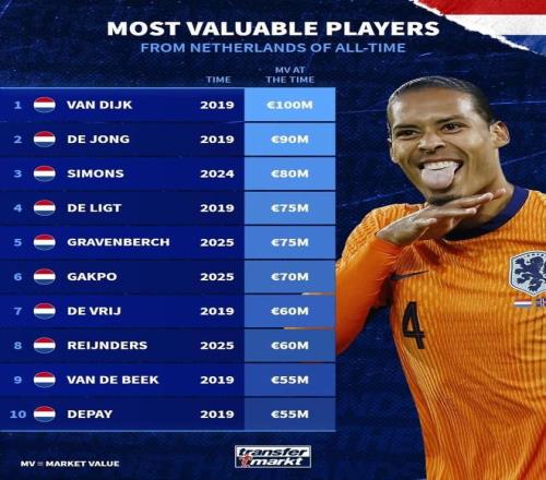 北京时间10月13日,德转统计出了荷兰球员历史身价榜,2019年身价曾经达到1亿欧元的范戴克排名第一,弗朗基-德容9000万欧元排名第二,哈维-西蒙斯8000万欧元第三。