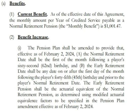 根据NBA球员工会最新劳资协议(CBA),球员养老金采取阶梯式分档制度,领取年龄不同,金额差距显著: