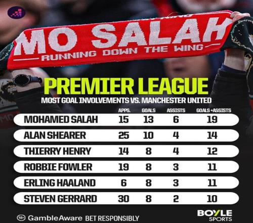 13球+6助攻,萨拉赫是英超历史上对曼联进球及助攻最多的球员