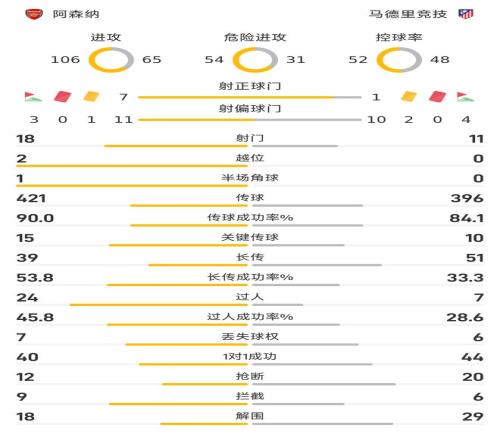 控球率方面,阿森纳52%,马德里竞技48%。传球数据方面,阿森纳全场421次传球(关键传球15次),传球成功率90%;反观马德里竞技全场396次传球(关键传球10次),传球成功率84.1%。