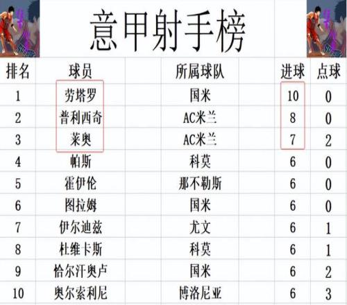 射手榜方面,劳塔罗10球继续领跑,普利西奇今天未能进球,还是8球排在第2。莱奥打入绝平 一球,超过图拉姆,伊尔迪兹,恰尔汗奥卢等人,7球独居第3。
