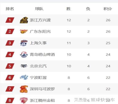 排在积分榜第6名则是宁波队,这一轮比赛他们在主场爆冷掀翻山西队,成功拿到赛季第8胜,以8胜6负的战绩,位居积分榜第6。深圳队则紧随其后,他们这一战爆冷击败上海队,排在积分榜第7名。而积分榜第8名则属于浙江队,他们的战绩也是8胜6负。积分榜第9名则属于山东队,这一轮比赛他们轻松击败吉林队,成功拿到一波7连胜,凭借着这一波连胜,他们的战绩也变成9胜4负。在少赛一轮的情况下,他们还是排在积分榜第9名。